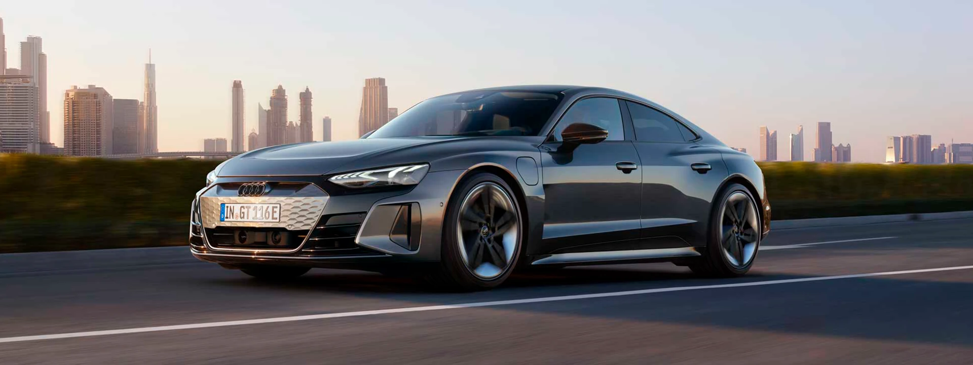 A linha de ombro ousada pronunciada, assim como o difusor traseiro diferenciado, dá ao Audi RS e-tron GT uma aparência impactante de força. Por sua vez, a linha de teto levemente inclinada, que se alonga até a traseira do veículo, expressa o quanto almeja por velocidade, mesmo quando ele está estacionado.